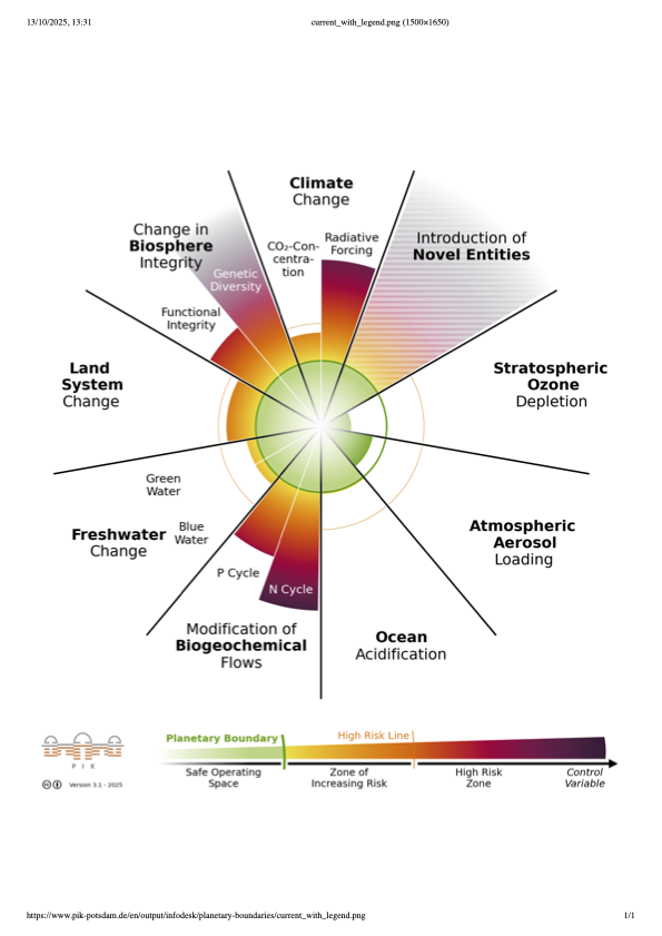 The current status of the nine Planetary Boundaries, based on the Planetary Health Check 2025. This visualization was published by PIK under the CC-BY license. Figure version 3.1 (2025).